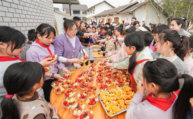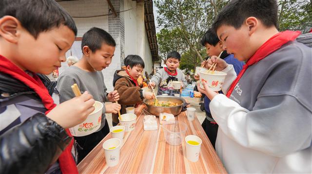 学生品尝美食。