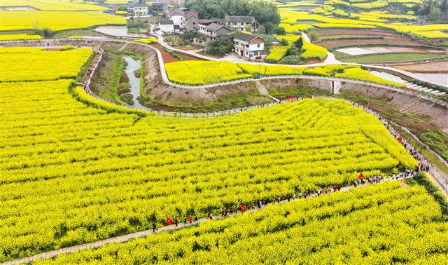 4月2日,在沙坪镇毕桥村油菜基地,盛开的油菜花将乡村景致装点得如诗如画。