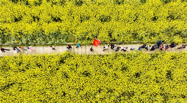 师生徒步油菜花海。