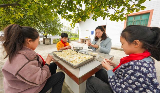 师生一起包饺子。