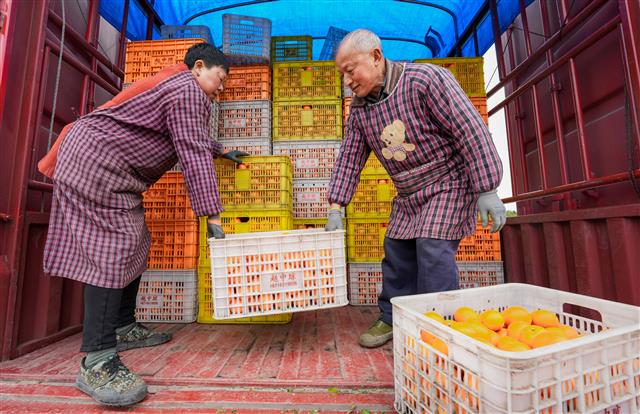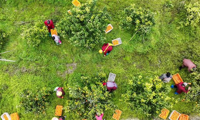3月13日,高峰镇大井村晚熟柑橘基地,黄橙橙的柑橘挂满枝头,工人正忙着采收柑橘并装车,及时送往城区各大超市。
