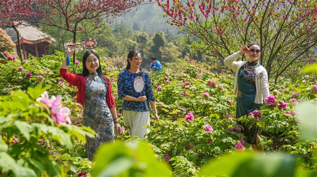4月7日,澄溪镇华夏牡丹园内,牡丹花竞相绽放,游客徜徉于花海间拍照打卡。