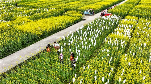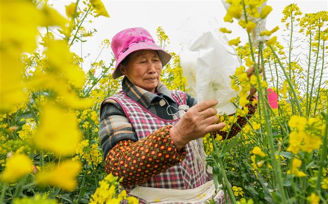 工人在为油菜花套袋。