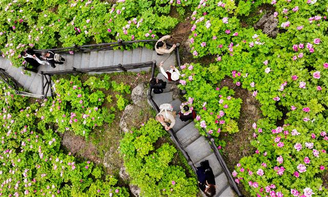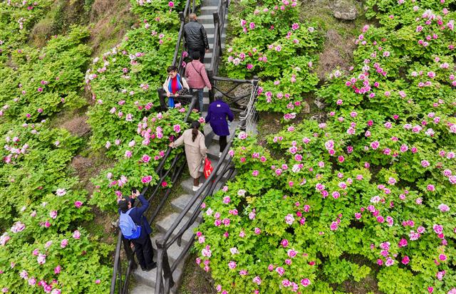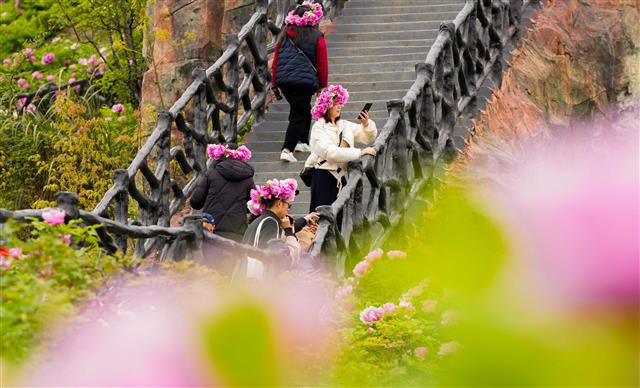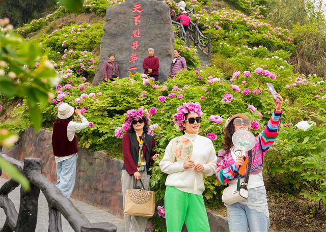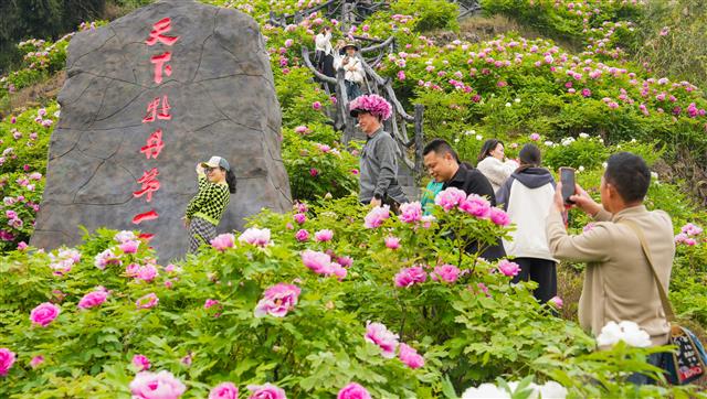 4月1日,在太平镇恺之峰旅游区,千亩牡丹花层层叠叠的花瓣围绕金黄色的花蕊盛开,镶嵌在密密的绿叶之中,散发出扑鼻的香味,彰显出春天的生机与活力,游客徜徉在花海拍照“打卡”。