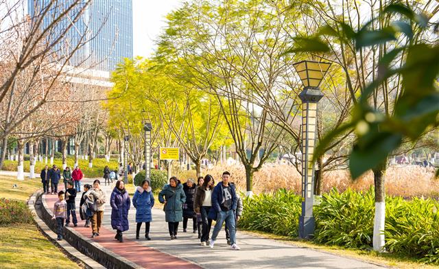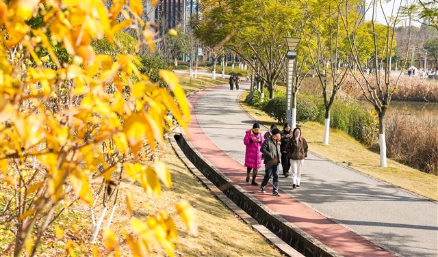 冬季的牡丹湖湿地公园,蜡梅花开香气扑鼻,与五彩斑斓的公园相互点缀,不少市民前来休闲漫步。