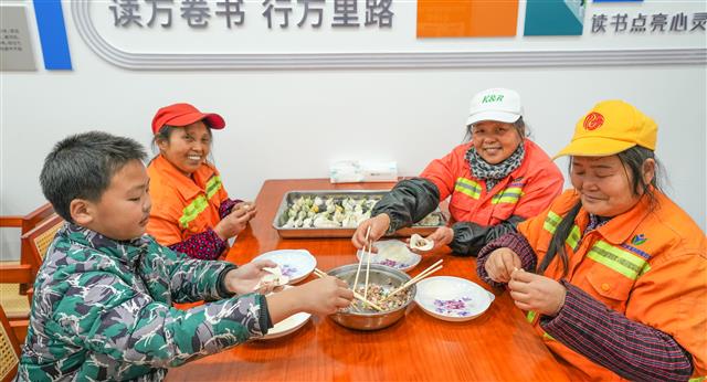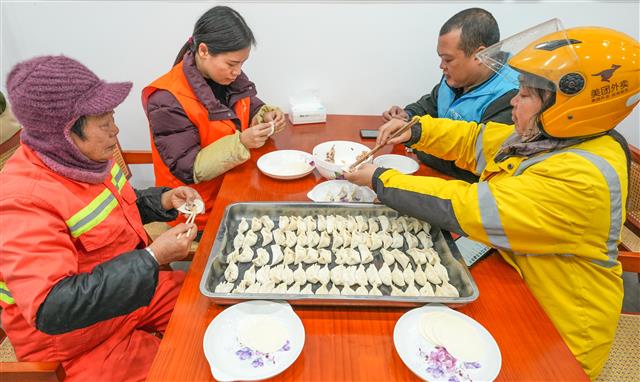 (社区工作人员和环卫工人、外卖员一起包饺子。)
