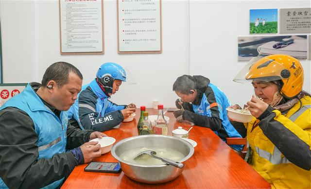 (外卖员吃上热饺子。)
