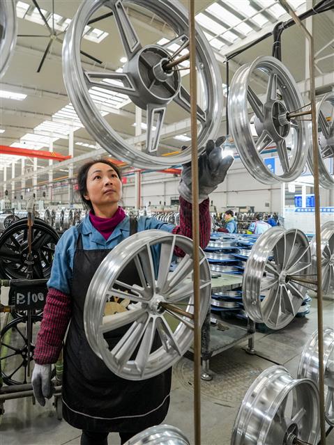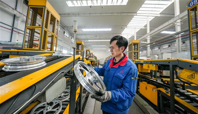(轮毂厂生产流水线上,技术工在赶制一批出口轮毂。)