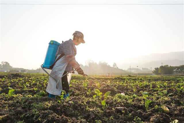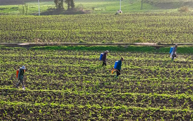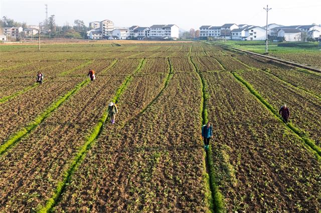 (村民正在进行油菜管护。)