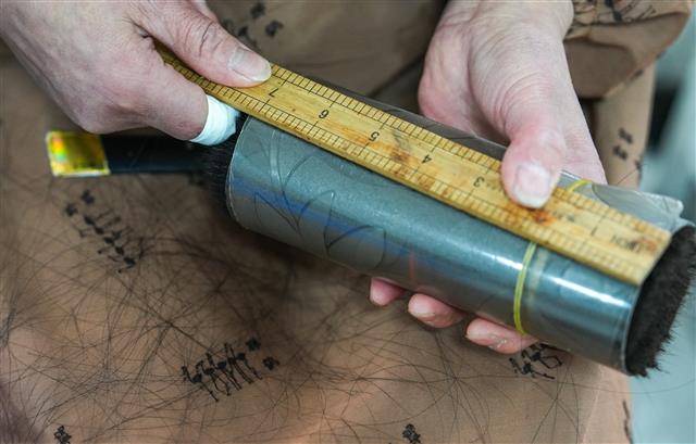 (工人在量假发原料尺寸。)