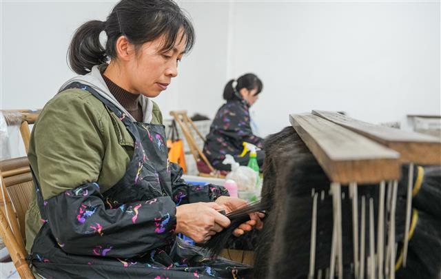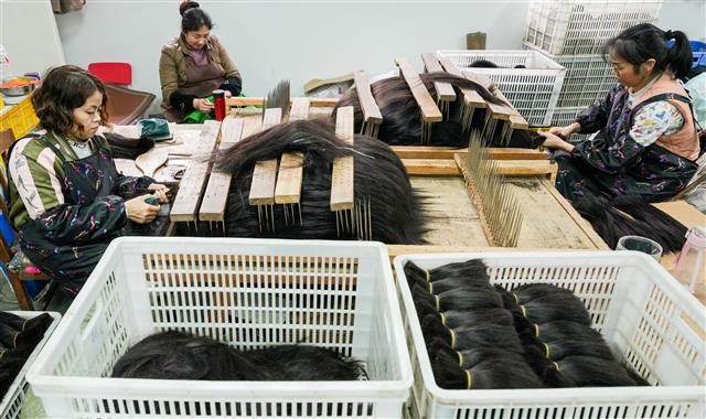 (工人在整理假发原料。)