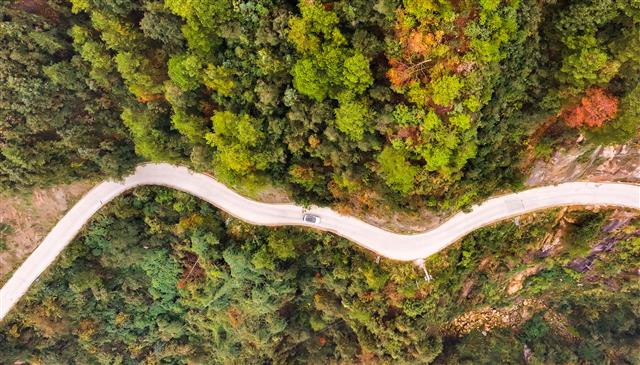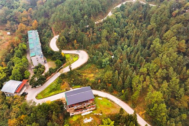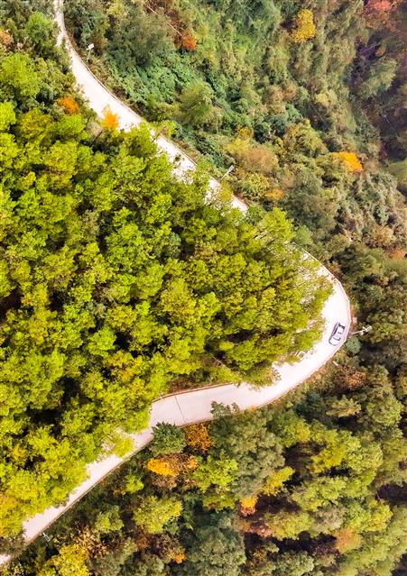 近日,记者在桂阳街道群山村看到,五彩斑斓的公路蜿蜒曲折,勾勒出令人心醉的冬日山间盛景,色彩斑斓美如画。