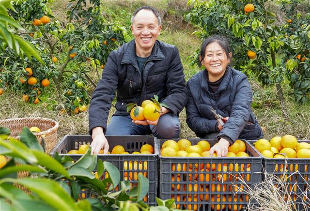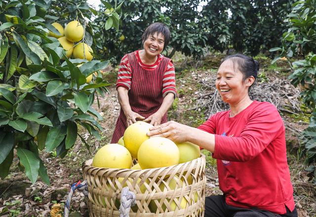 太平镇卧龙村果农满怀丰收喜悦采收柑橘。