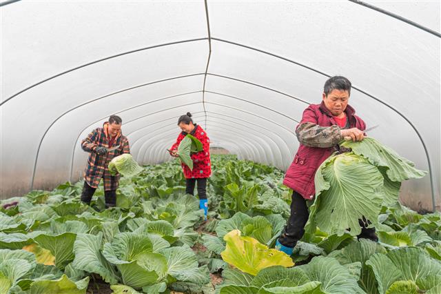 农民采收卷心菜。