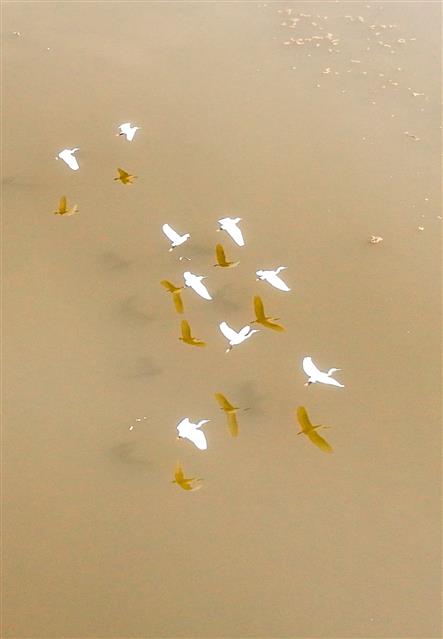 (成群的白鹭飞翔在湖面。)