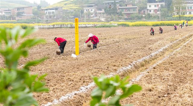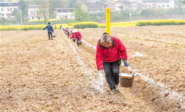 4月3日,沙坪镇毕桥村高粱基地,工人趁着晴好天气为高粱施有机肥。近期天气晴好,是春耕备耕的好时节。垫江各农户、种植基地抢抓农时不误农事,忙碌于田间地头,为粮食稳产增收打牢基础。