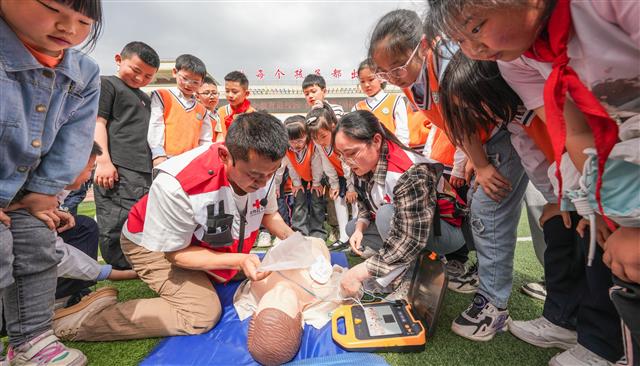 (红十字会工作人员展示心肺复苏方法。)