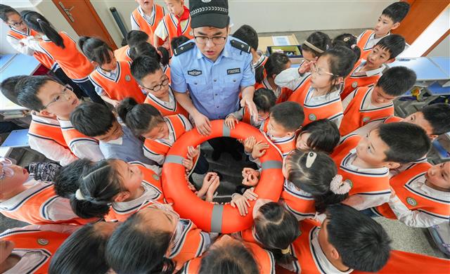 (民警讲防溺水安全。)