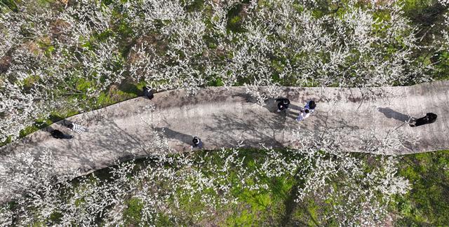 3月20日,杠家镇龙泉山李子基地,漫山遍野的李花美如画,游客徜徉在花海里赏花拍照。