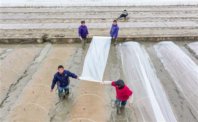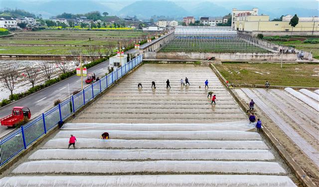 3月18日,沙坪镇毕桥村制种水稻基地,大雨过后,工人抢抓晴好天气开展水稻育秧工作。撒种、搭拱棚、拉膜、盖膜……工人躬身忙碌,为粮食稳产增收跑好“第一棒”。