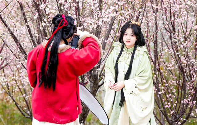 2月15日,三合湖湿地公园,次第绽放的梅花点缀了公园美景,不少市民前来赏花观景。