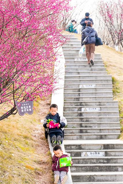 小朋友正在梅花树下玩耍。