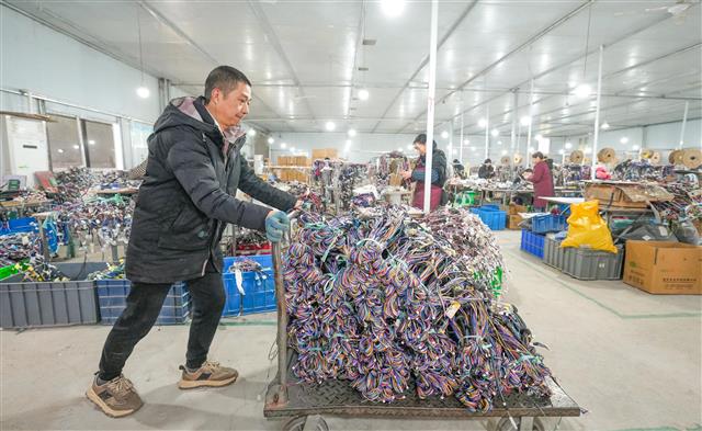 2月22日,长龙镇高桥社区微企业工厂内,工人在赶制一批家电电源线。