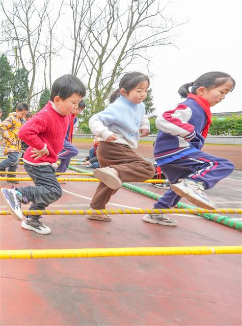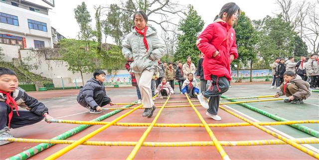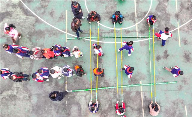 2月24日,在垫江县三溪小学校,学生利用大课间在操场跳竹竿舞。随着音乐响起,竹竿在孩子们手中上下翻飞。孩子们动作轻盈、协调,脸上洋溢着纯真的笑容。