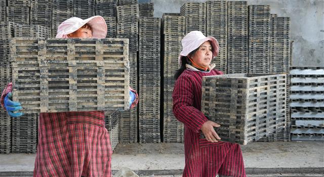 (工人搬运育秧盆。)