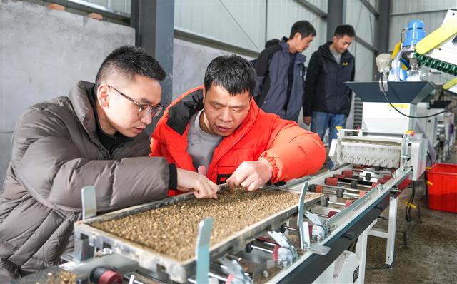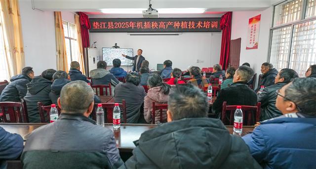 3月6日,在新民镇明月村育秧工厂,工人正有序进行放置秧盘、底层培土、加湿、播种、二次覆土等水稻育秧工作。四川农业大学水稻研究所教授在为长寿区、梁平区和垫江县的水稻种植大户讲解机插秧高产种植技术。