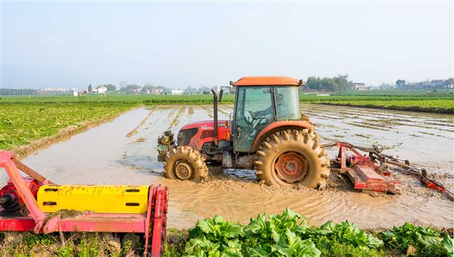 (农机点缀田间。)
