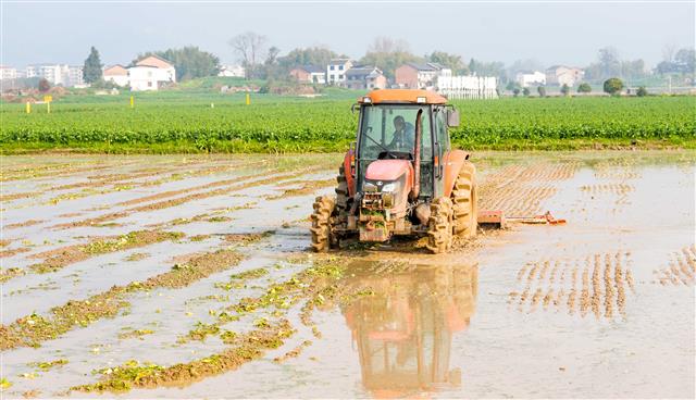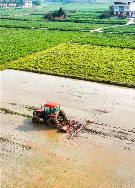 2月25日,沙坪镇李白村高标准农田,村民开着农机忙着翻耕水田,为育秧做准备。