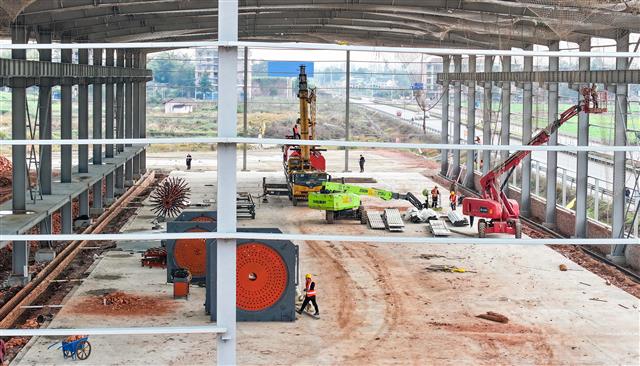 2月10日,新民镇垫丰武高速一标段数字钢筋集中加工厂内,工人正在抓紧项目施工,现场一派火热的建设景象。