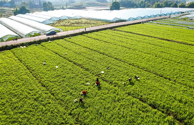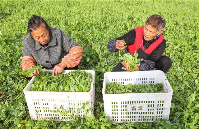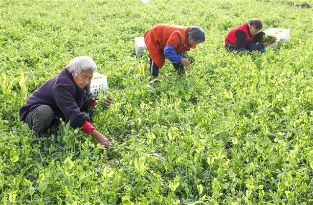 日前,记者在新民镇明月村豌豆尖基地看到,10余名工人正在采收豌豆尖,准备售往重庆主城区。