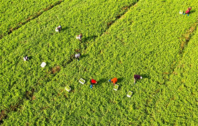 工人在地里采收豌豆尖。