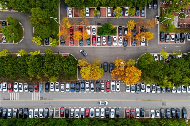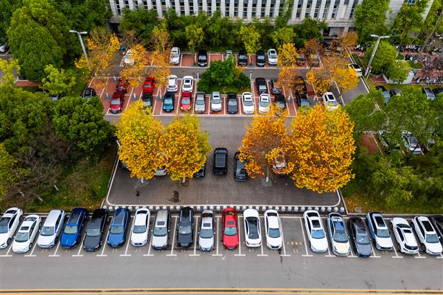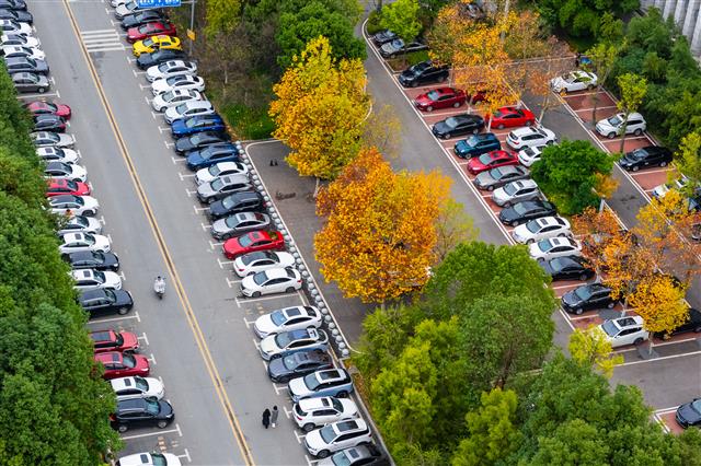 11月26日,在桂西大道南段行政服务大厅停车场,社会车辆在共享停车位上有序停放。