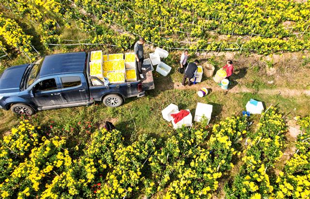 11月7日,沙坪镇安坪村金丝皇菊次第绽放,金黄的花朵将一个个山头装扮得格外“吸睛”。