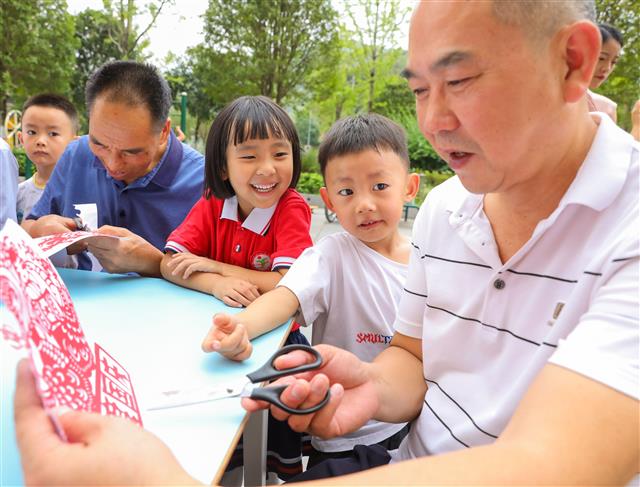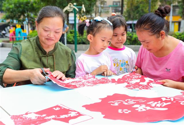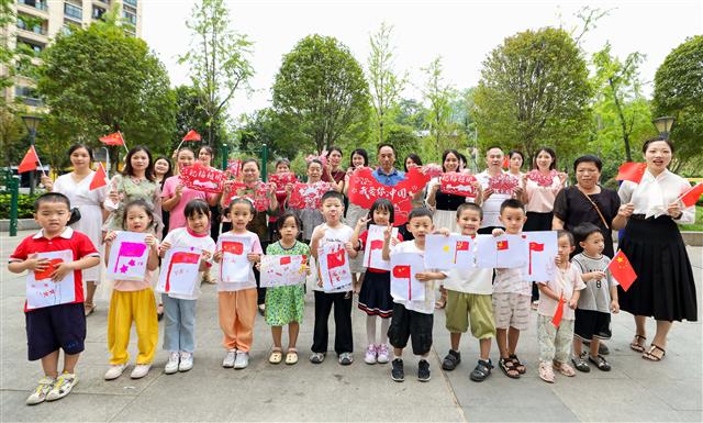 9月29日,在桂阳街道天宝社区,社区工作人员、县教委示范幼儿园的小朋友和社区居民一起开展迎国庆活动。市民通过剪纸的方式来迎接国庆节,小朋友用绘画表达对祖国的热爱,营造了浓浓的节日氛围。