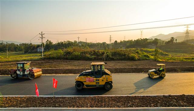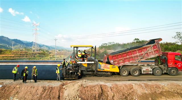 10月27日,G350澄溪至群力段新改建工程太平镇段,工人正配合工程车铺设沥青,压路机来回夯实路基,现场一派热闹景象。