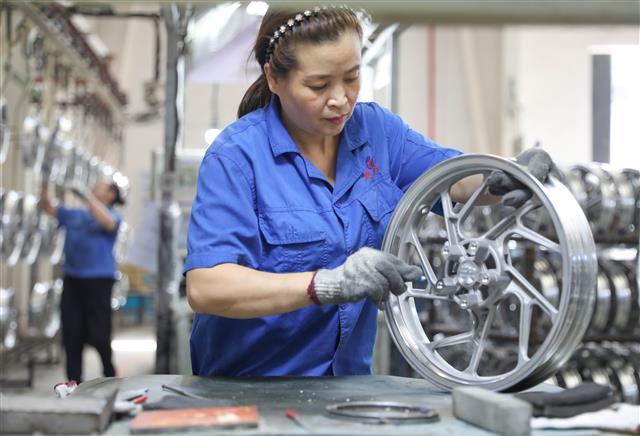 近日,重庆捷力轮毂制造有限公司生产车间内,工人正在赶制出口轮毂产品。目前,该公司摩托车、汽车轮毂迎来了产销旺季,各条生产线均保持“满负荷”生产状态,加紧赶制海外订单。