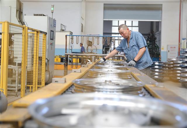 (工人正在检查轮毂质量。)