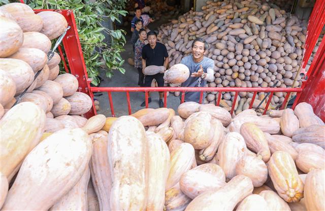 (工人把南瓜装车。)