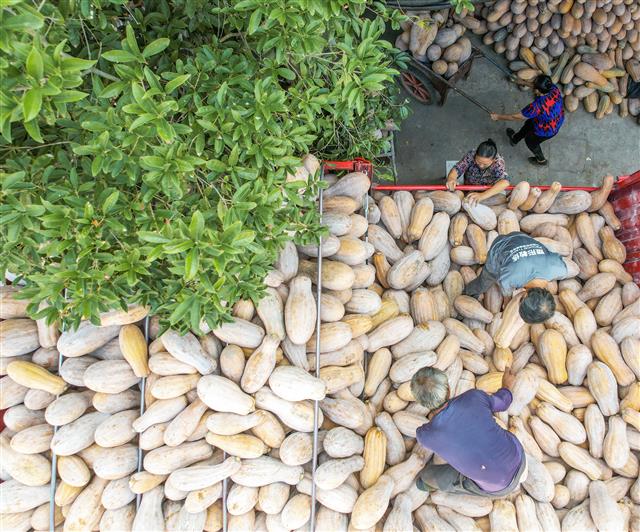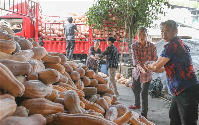 9月18日,大石乡豹山社区蜜本南瓜基地集中收购点,统一收购村民的南瓜。