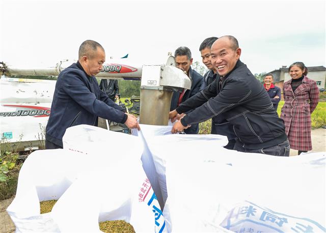 (再生水稻装袋。)