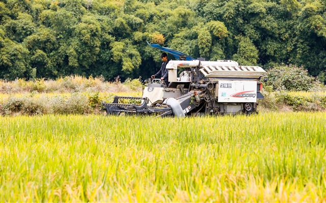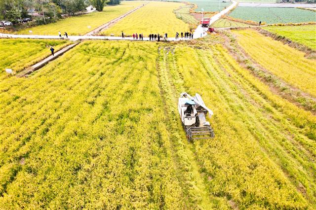 (收割机正在收割再生稻。)