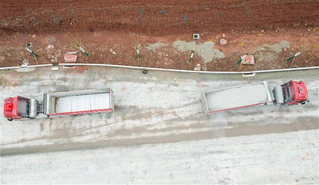 (工程车来回运输材料。)
