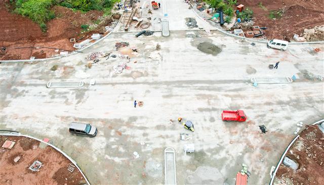日前,在软件产业大道项目二标段施工现场,工人正在对边沟和路沿等附属设施进行施工,工程车来回运输材料抓紧道路建设。