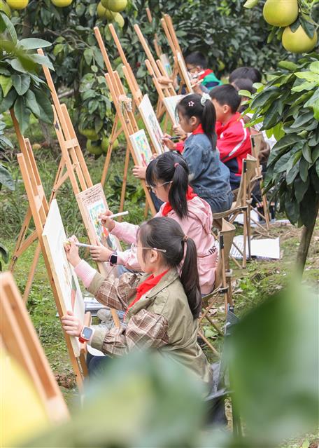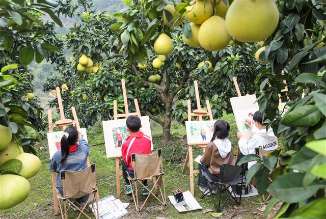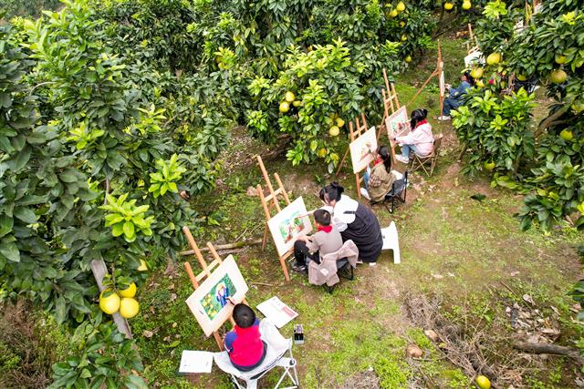 (学生在柚子林中画画。)