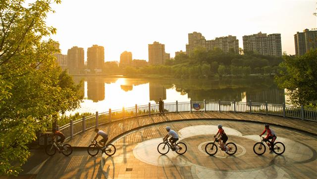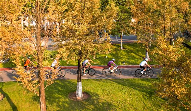 近日,牡丹湖湿地公园,迎着晨曦,一群骑行爱好者穿行在红杉林下,呈现出一幅宜居宜游的城市生态画卷。