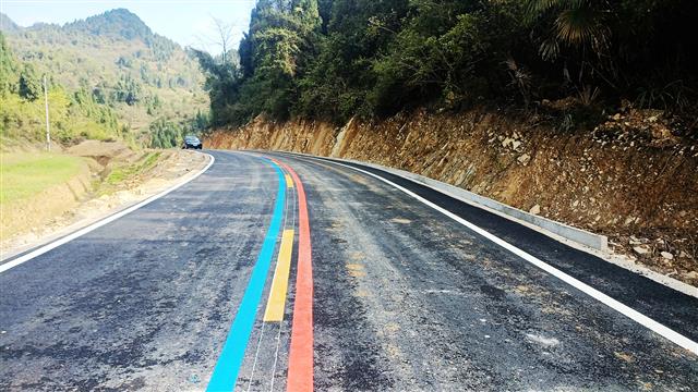 当天,记者在天池坝森林防火公路看到,带有彩色标线的双向车道宽敞平整,就像一条长长的彩色“丝带”,蜿蜒在绿林山水间。